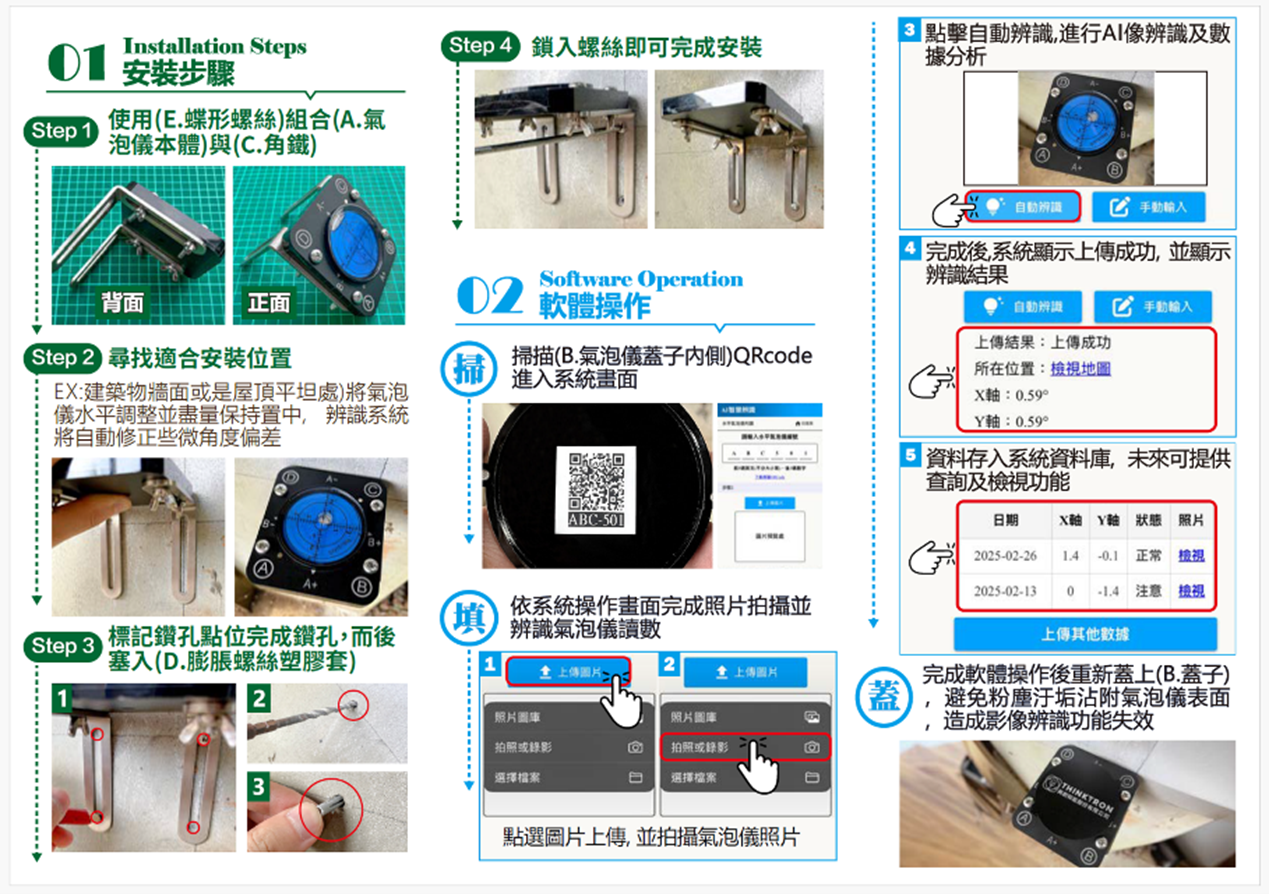 以IoT與AI技術建構示警支援平台。裂縫尺與水平氣泡儀具備低成本、可量化之特性,搭配AI智慧辨識,可使社區居民僅需拍照上傳,即能自動回傳數據並觸發警示,突破專業監測與民眾自主間的落差,逐步落實防減災普及化。