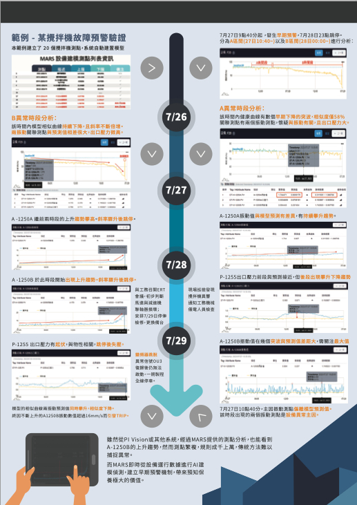 MARS 基於關鍵設備的時序數據,自動建立異常識別模型,即時產生健康度/相似度曲線與重建誤差,在設備效能出現偏移的早期(可提前數天至數週)發出預警。系統同時提供關聯測點排序與根因推論、Web 即時監控與知識管理,協助現場快速定位問題、安排維護,降低非計畫停機與產能損失。功能內容包含:★「多變數時序建模與異常偵測」:非線性分析、健康度/相似度曲線、重建誤差監控。★「自動化與少程式化(No-Code)建模」:互動式資料清洗、設備屬性視覺化配置、一鍵部署。★「關聯與根因分析」:關聯測點排序、單點「實測 vs. 預測」對比、事件時間軸比對。★「資料整合與即時監控」:連接 PI/AF、即時 Web 監控面板、告警治理與知識管理。★「MLOps 與模型治理」:版本管理、再訓練與回訓、門檻管理與效能追蹤。