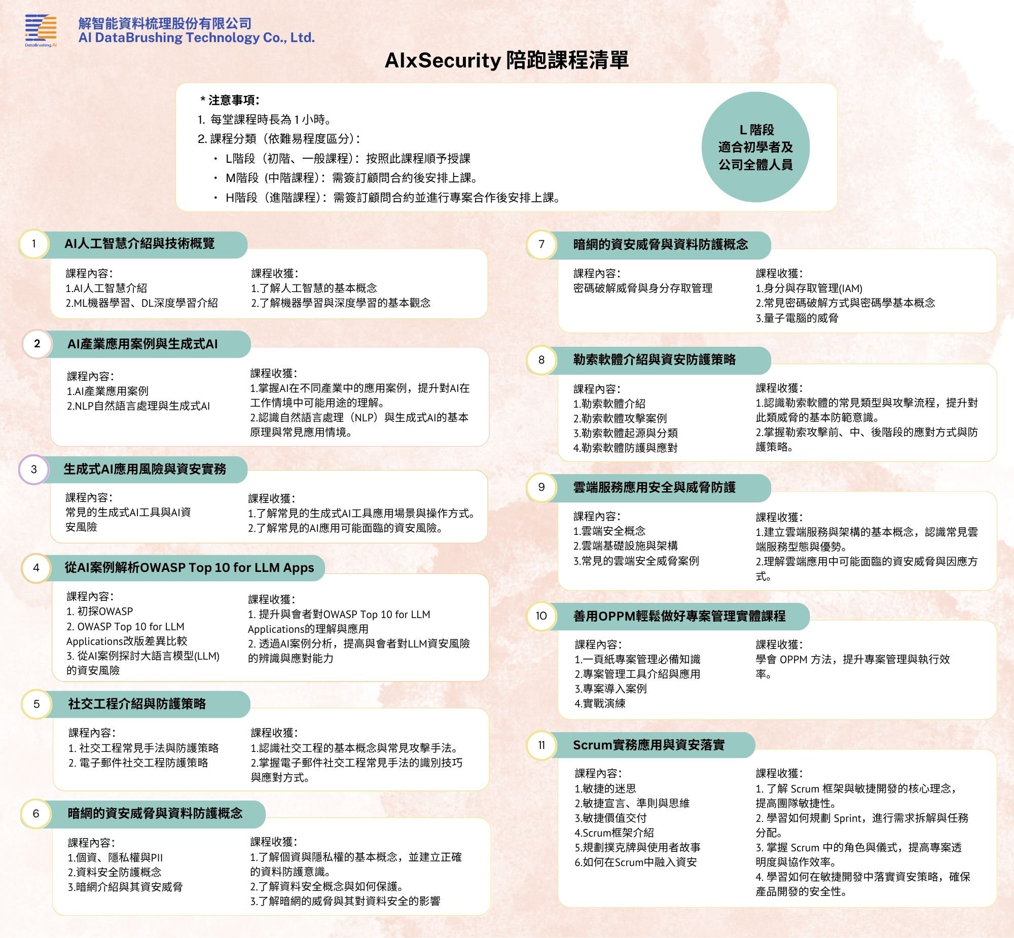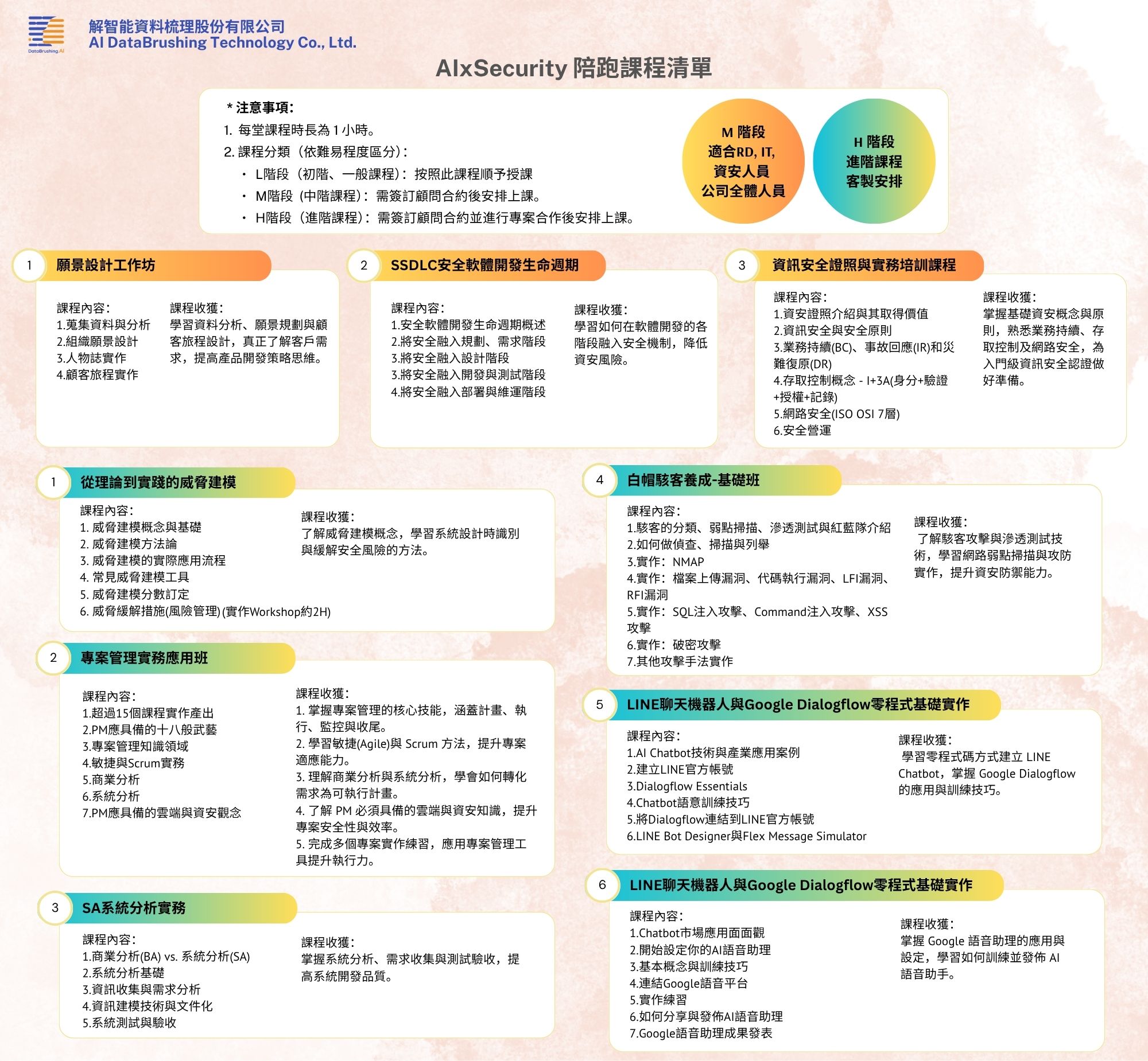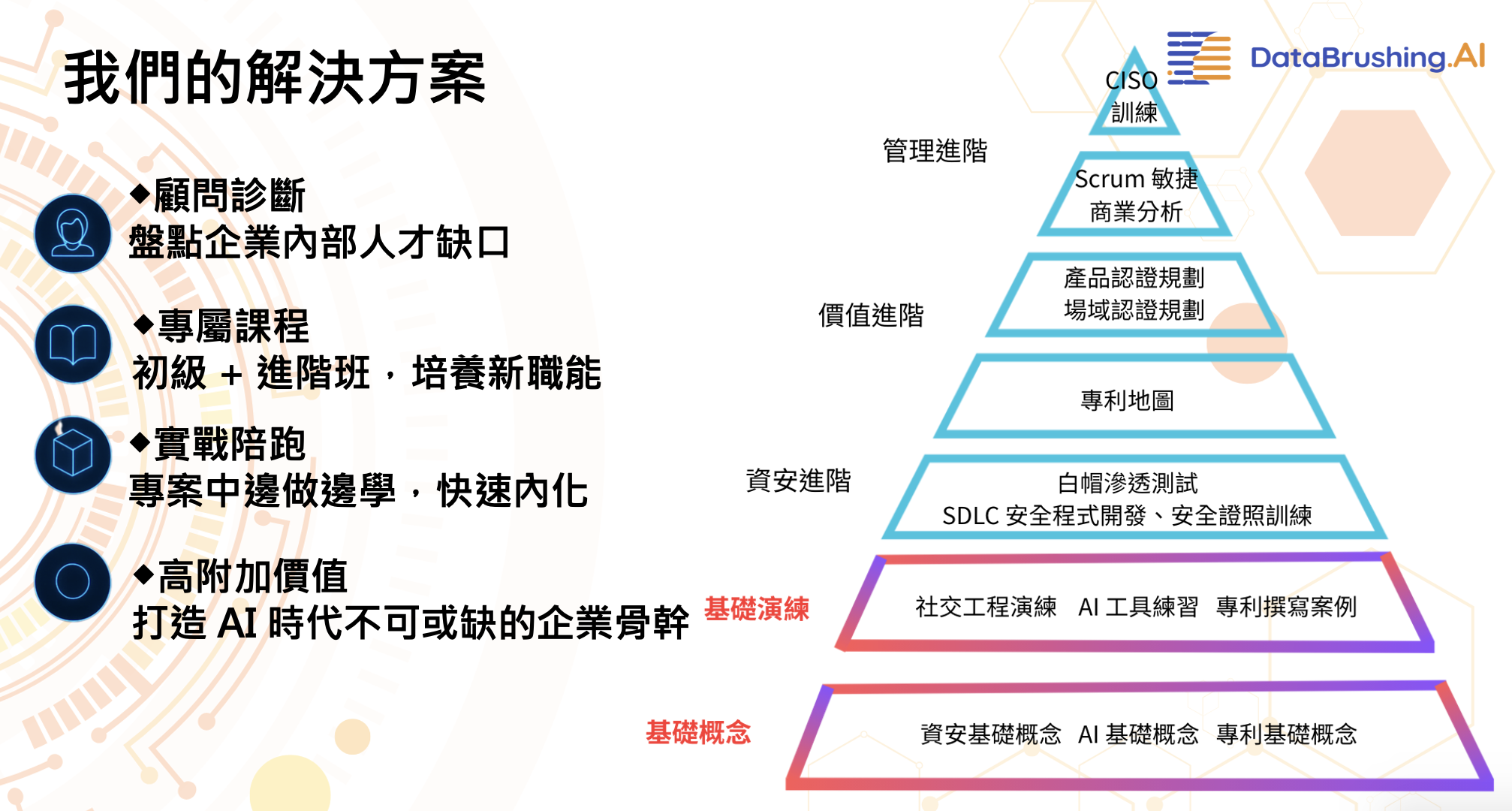 AI 導入策略規劃、AI 教育訓練與能力建構、資料治理與資料清洗規劃、智慧製造與資安應用顧問服務