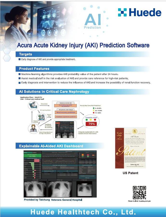 運用人工智慧技術,能有效率地預測未來發生AKI、ARDS風險,建立預測、警示、處置建議的閉環系統,提升照護品質。並且能有效地找出高危險群,及早介入,達到早期預防,早期處理的目標,以縮短病程及提升腎功能恢復的可能性。 本產品現已正式導入臺中榮民總醫院。於臨床應用中,醫護人員不僅可獲得AI模型輸出的風險機率值,更能針對高風險個案提前進行臨床評估與醫療介入,以達到疾病預防與早期治療之效果。 以急性腎損傷(Acute Kidney Injury, AKI)為例,透過本產品之使用可提前辨識高風險病人,藉由醫療處置以減少AKI的發生或降低病情嚴重程度。對病人而言,可有效降低洗腎風險與高額醫療支出;對醫療體系而言,則能減輕醫護人員照護負擔並降低健保支出,達成臨床與經濟雙重效益。 短期規劃,目前已向臺中市政府衛生局申請自費項目核准。醫療院所可比照既有自費項目流程,向同意使用本服務之病人收取新台幣5,400元之費用。 長期規劃,隨著本產品臨床實證逐步累積,預期能有效降低健保支出,未來將爭取納入健保給付體系,達成「預防疾病發生、降低醫護負擔、減少健保支出」三贏目標。